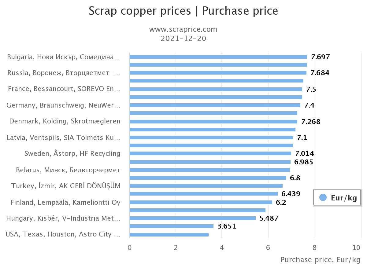Copper scrap costs almost up to $ 7,700 per ton in Bulgaria. An overview of scrap copper prices based on the information on the website scraprice.com. According to scrap metal purchase price information on scraprice.com, the highest price of copper scrap today (20.12.2021) was in Bulgaria. Almost 7700 Eur per ton of copper scrap today cost in Novi Iskar, Bulgaria. Such a price could be offered by a company "Сомедина 7 ООД". Copper scrap prices continued by country as follows: Poland - "JANAR Skup złomu" - copper scrap price 7,696 Eur/kg, Russia - "Вторцветмет-Черноземье" - copper scrap price 7,684 Eur/kg; Belgium - AZ Kabel BV - copper scrap price 7.55 Eur/kg.